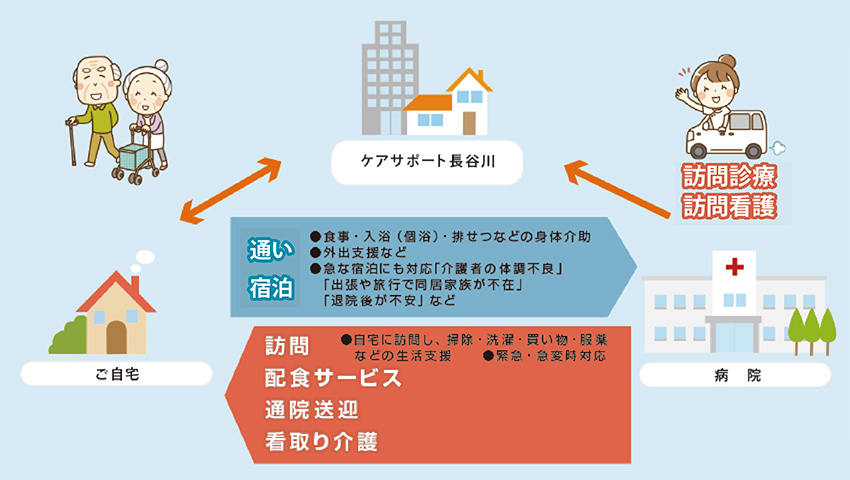 「通い」を中心に「宿泊」「訪問」の3種類のサービスをご本人の様態や希望に応じて組み合わせ、居宅で継続して生活するための支援を行います。